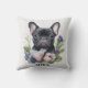 Travesseiro decorativo de cachorro preto francês personalizado com design floral no estilo aquarela. Apresentando flores roxas, azuis e rosa e um filhote adorável. Decoração doméstica para amantes de animais de estimação.