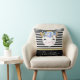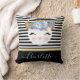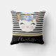travesseiro rosa da princesa gatinho monograma. Bonito princesa de gatos, cara a rosa dourado, rosa-pincel e brilho dourado, nariz cor-de-rosa e grandes lascas oculares brilhantes de ouro, com um arranjo floral azul e coroa. Linhas negras e brancas de fundo listrado com fita de ouro. Personalize e adicione facilmente seu nome para personalizar o travesseiro.