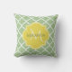 Um travesseiro decorativo quadrado quatrefoil verde-primavera verde-chic com um crachá de monograma amarelo brilhante que você pode personalizar adicionando seu nome e inicial a. Esta é parte da Coleção de Primavera Amarelo Verde Nilo e Lark Amarelo.