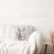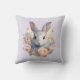 A pillow with a sweet and adorable watercolor image. A bunny rabbit with white and gray fur. A garland of carnation flowers in pastel colors of pink and peach. A cute Easter, birthday or baby shower image for bunny rabbit lovers.