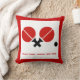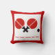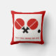 Rackets de pingue-pongue de tênis de mesa e travesseiro decorativo preto e vermelho. Ele exibe um ícone de pictograma minimalista de raquetes e bolas de tênis pretas e mesa pretas vermelhas e seu texto sobre fundo branco com borda vermelha.