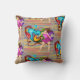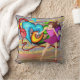 Garota com cabelos castanhos compridos dançando e um fundo de parede de grafite. Um lado do travesseiro tem um impressão grande e o outro lado tem um padrão de repetição menor. Há uma série dessas impressões com caracteres diferentes.