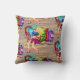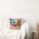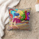 Garota com longos cabelos loiros dançando e um fundo de grafite. Um lado do travesseiro tem um impressão grande e o outro lado tem um padrão de repetição menor. Há uma série dessas impressões com caracteres diferentes.