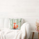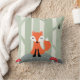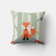 Travesseiro bonito e do divertimento que caracteriza uma ilustração dos desenhos animados de uma raposa pequena que senta-se em uma rocha na floresta. Ao lado dele são os cogumelos coloridos e um pássaro pequeno está espreitando para fora de um ninho em uma das árvores. Ilustração por Mhea.