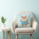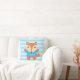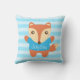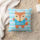 Decorar o quarto das crianças com este travesseiro bonito e colorido. Ela tem uma raposa avermelhada e marrom vestida com uma camiseta azul brilhante acenando suas patas amigáveis. Personalize com o nome da criança no espaço disponível. Listras horizontais azuis claras como fundo. Excelente para o quarto de meninos com esquema de cor azul ou quarto de crianças com um tema de animais florestais. Travesseiro adorável que você também quer abraçar!