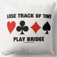 Mostre sua atitude de ponte rápida com esta ponte memorável dizendo o travesseiro decorativo de conselhos com quatro naipes de placa junto com a seguinte linha, frequentemente ouvida em torneios de ponte: "Perder Track Of Time Play Bridge".