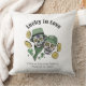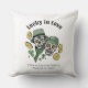 Esta almofada decorativa irlandesa "Sortudo no Amor" apresenta caveiras de açúcar desenhadas à mão vestidas com chapéus e cachecóis irlandeses, cercados por moedas de trevo de ouro e trevos verdes. Fundo branco elegante. Personalize com os nomes do casal e a data do casamento. Ideal para recém-casados, aniversário de casamento, casamento, chá de panela de casamento, chá de noiva, etc.