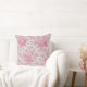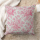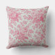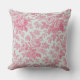 A throw pillow featuring a vintage red and mint green floral toile de jouy pattern of roses.