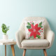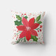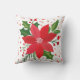Um travesseiro decorativo quadrado apresenta um design festivo de férias. O travesseiro tem um fundo branco com um padrão de pontos pequenos e espalhados em vários tons de vermelho e rosa. Centrado no travesseiro está uma flor grande, estilizada de poinsettia vermelha, com pétalas pontiagudas. O centro da flor é adornado com um aglomerado de pequenos pontos brancos, parecidos com os estames da flor. Em redor da poinsettia, encontram-se os filhotes de folhas verdes e ocas, com bordas irregulares e aglomerados de pequenas e vermelhas. O estilo geral é simples e gráfico, com cores planas e linhas limpas, dando-lhe uma aparência moderna e alegre.
