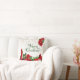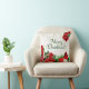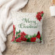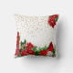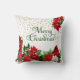 Este elegante travesseiro de Feriado apresenta uma borda inferior de poinsettia vermelha, sagrada, verde e embelezamento de ouro. Em uma ponta está um cardeal vermelho empoleirado sobre uma poinsettia branca florescente. O canto superior direito tem um buquê de poinsettia vermelha menor, e "Feliz Natal" está em texto verde estilizado no centro. Tudo é colocado sobre um fundo branco com uma estrela dourada confetti. A parte traseira do travesseiro tem a mesma imagem sem o texto.