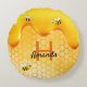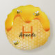 Um padrão de colmeia de abelha ouro e abelhas adoráveis sorrindo. Decorado com mel doce gotejante. Adicione o seu nome e letra monográfica, letras laranja e preto. O nome é escrito com um script de estilo manuscrito.