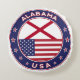Crachá do Alabama com bandeira do Alabama e bandeira dos EUA, cores, forma arredondada. Emblema do Alabama. Selo do Alabama. Coleção dos Estados Unidos.