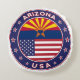 Crachá de Arizona com bandeira de Arizona e bandeira de cores USA, forma arredondada. Emblema da Arizona. Selo de Arizona. Coleção dos Estados Unidos. Phoenix, Tucson, Mesa, Chandler, Glendale, Scottsdale, Gilbert, Tempe, Peoria, Surpresa