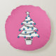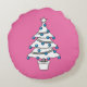 Uma ilustração de uma elegante árvore de Natal branca e chique com muitas bolas azuis penduradas em fundo rosa. Esta design é para pessoas que amam o Natal, dando presentes e presentes.