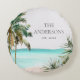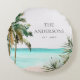 Adicione um toque tropical à sua decoração de casa de praia com este travesseiro redondo personalizado! Apresentando palmeiras de aquarela, uma cena de praia azul e vibrações costeiras de verão.