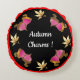 Travesseiro redondo personalizável com texto branco, fundo preto e vermelho. Este travesseiro único apresenta charmosos, brancos, desenhados à mão e digitalmente design, texturizados com folhas de alumínio, bolotas cor-de-rosa e folhas coloridas de outono. Excelente travesseiro de outono para celebrar um chá de fraldas e decorar a sala de infantários. Travesseiro perfeito para meninas que adoram adicionar um toque balbucioso ao seu quarto. Se o desejo mudar "Charms de outono! " com o seu texto preferido.
