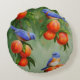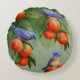 Dois pássaros azuis ocidentais percham numa árvore de pêssego, enquanto um terceiro pássaro azul se senta num cesto de madeira tecido cheio de fruta recém-colhida pronta para comercialização.