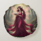 Uma bela fada vestindo um vestido vermelho e uma joia que fluem de rubis com lírios d'água em seu longo cabelo vermelho e asas tipo libra vermelha segurando um lírio d'água fica em um lago superficial em uma floresta mágica cercada de lírios d'água, almofadas de lírios, flores rosa e árvores cobertas de cipós.