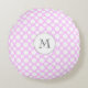 Uma inicial personalizada com uma letra de bloco vintage em um travesseiro redondo com bolinhas brancas a rosa.