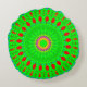Round throw pillow in colors of bright green and red accents in a bohemian style design.