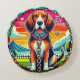 Ilustração admirável ao estilo cartoon de um cão com olhos brilhantes, vestindo uma coleira e uma corrente, colocada contra um fundo circular colorido.