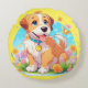 Um travesseiro redondo com uma fotografia de um filhote fofo sentado entre as flores. Ele parece muito feliz por estar cercado por flores e borboletas. O presente perfeito para dar àqueles que amam cachorros. Contém conteúdo generativo.