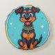 Ilustração admirável no estilo cartoon de um filhote preto e marrom feliz vestindo um colar azul e sentado sobre um fundo colorido. Perfeito para designs alegres, temas infantis e projetos relacionados com animais.