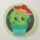 Uma almofada redonda com uma ilustração fofa de um cacto verde sentado em um vaso de flores. Olhos grandes e kawaii e usando um sombrero vermelho. O fundo é um padrão com espirais verde-limão.