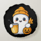 Um fantasma giro em uma colmeia laranja, segurando uma abóbora e um café. As vibrações confortáveis e o charme assustador criam um feliz Dia das Bruxas de outono.