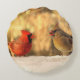 Aqui está um travesseiro redondo com o Sr. e a Sra. Norte Cardinal. É o outono com uma folhagem gloriosa no fundo, mas a primeira neve caiu para nos dar uma prévia do inverno. Ele é uma cor vermelha brilhante. Ela é laranja, ouro e marrom. Ambos têm cristas e bicos de laranja. Eles são verdadeiramente a realeza dos pássaros do quintal com sua música distintiva e cores adoráveis.