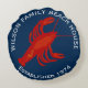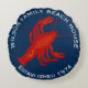 Vermelho, branco e azul, almofada de casa de praia da família lagosta vermelha redonda. Personalize com texto curvo impresso na parte superior e inferior. Inclua o nome da família e o ano de estabelecimento. Uma grande silhueta de lagosta no centro.