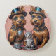 Esta ilustração cativante apresenta dois encantadores Terriers Yorkshire, cada um enfeitiçado com chapéus elegantes azuis e brilhantes, situados numa sofisticada sala de cor de pêssego embelezada com esplêndida arte na parede do rococó. Os cães, com o seu pelo sedoso e radiante retratado em detalhe refinado, beberam brincadeiras clássicas ornamentados, emanando uma aura refinada companhia alegre e agradável. No centro da cena, um minúsculo camundongo graciosamente balanceado sobre uma delicada placa encapsula a essência da amizade nesse belo tableau.