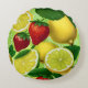 Uma vibrante almofada redonda com limões, limas e morangos brilhantes em um estilo botânico fresco sobre um fundo verde suave. A paleta alegre e estival adiciona um acento animado às salas de estar, quartos e espaços aconchegantes de leitura. Uma escolha elegante para mulheres que amam motivos frutados, decoração colorida e acessórios para casa prontos para presentear.