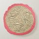 Apresenta um medalhão de arte nouveau, metálico-dourado, gravado, sobre fundo rosa-coral. Ele tem um impressão de padrão dourado na parte de trás, então é inversível. Um design elegante e sofisticado.