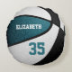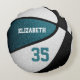 Este travesseiro temático de basquetebol para meninas ou meninos apresenta a imagem realista de uma bola de basquete que tem painéis coloridos de cor branca e preta alternados - personalize com o nome do atleta e o número de camisa - por katz_d_zynes