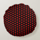 Pequenas flores vermelhas com corolla laranja espalhadas sobre a superfície escura desse travesseiro, gerando assim um padrão visual regular