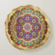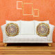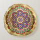 Travesseiro decorativo elegante de sotaque redondo feito em um tom de ouro, com uma mandala dourada e colorida, no meio.