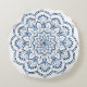 Travesseiro redondo delicadamente decorado no tema mandala indiano, nas cores branco e azul metálico.