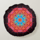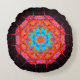 Mandala colorida com muitos padrões e um núcleo de energia azul em um travesseiro redondo.