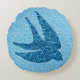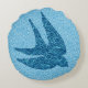 Travesseiro redondo numa Silhueta Mídia Mista de uma andorinha em voo, com um padrão de nuvem japonesa vintage em cobalto e azul pálido