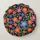 Um Travesseiro decorativo redondo muito bonito ou uma almofada, com um padrão floral sobre fundo negro, inspirado na Arte Folclórica da Europa Oriental. Parte da coleção 'Folk Heart' de Posh & Painterly.