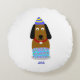 Vocês podem admirar meu adorável desenho de um filhote vestindo um chapéu de aniversário e um bolo de aniversário decorado, agora adicionado a este travesseiro decorativo redondo. Eu chamo este desenho, "Parabéns, Pup", este travesseiro decorativo redondo faz os cartões de aniversários perfeitos.