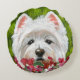 West Highland White Terrier e flores rosa. Cachorro ocidental a espreitar por um arbusto florescente. Sophie. Copyright © 2025 Angi Laframboise. Dons de cães de arte para amantes de cães.