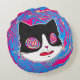 Um travesseiro redondo com o gato sobre fundo preto e texto de um lado, e apenas a cabeça de gato explosiva com um fundo colorido do outro. O gato de smoking está tendo um ataque de violência depois de muitos arranhões de barriga. Admire você mesmo os olhos loucos, ou entregue a uma pessoa especial que ama gatos e também zoomas. Cuidado! Está a fugir!