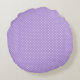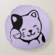 Um travesseiro redondo desenhado com a ilustração de um gatinho sorridente e balançando com um ponto preto ao redor do ouvido. Fundo roxo e um padrão de bolinhas no verso. Simples e adorável.