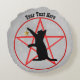 Este travesseiro de sotaque redondo é uma cinza clara com um gato preto assustador na forma de silhueta, alcançando uma estrela ouro em um pentagrama vermelho em um círculo vermelho. Personalize seu texto com o modelo.