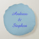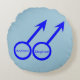 Este travesseiro redondo incrível foi projetado para gay. Apresenta dois símbolos masculinos azuis de pé lado a lado. O fundo é azul e há dentro de texto azul personalizável para cada um dos símbolos para colocar nomes.
