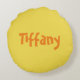 Uma almofada redonda de girafa fofa, este item apresenta um fundo bege com uma girafa na frente. A parte de trás tem um local para inserir seu nome em laranja. Personalize o seu hoje!