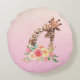 Um travesseiro redondo com um desenho fofo em aquarelas de uma mãe e girafa bebê. A girafa-mãe está descansando a cabeça sobre a girafa do bebê, amorosa e adorável. Bonito buquê rosa, amarelo, verde, de flor de aquarela colocado debaixo deste par de queridos. Um plano de fundo gradiente criado usando uma mistura de cor rosa suave em cor laranja de pêssego claro.