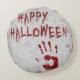 Uma ilustração horrível e assustadora do Dia das Bruxas, com uma impressão de mão sangrenta e uma espadilha de sangue num fundo gelado.